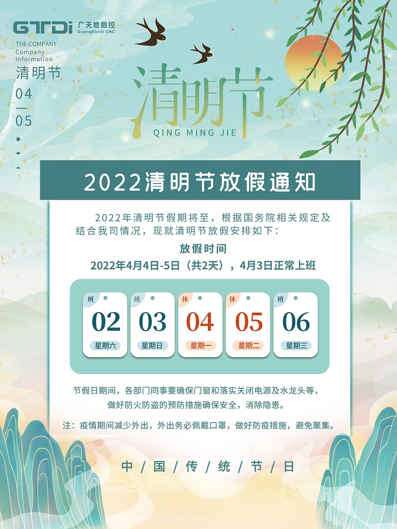 根据国务院办公厅《关于2022年部分节假日安排的通知》,并结合我司实际情况,完美电竞数控2022年清明节放假安排如下: